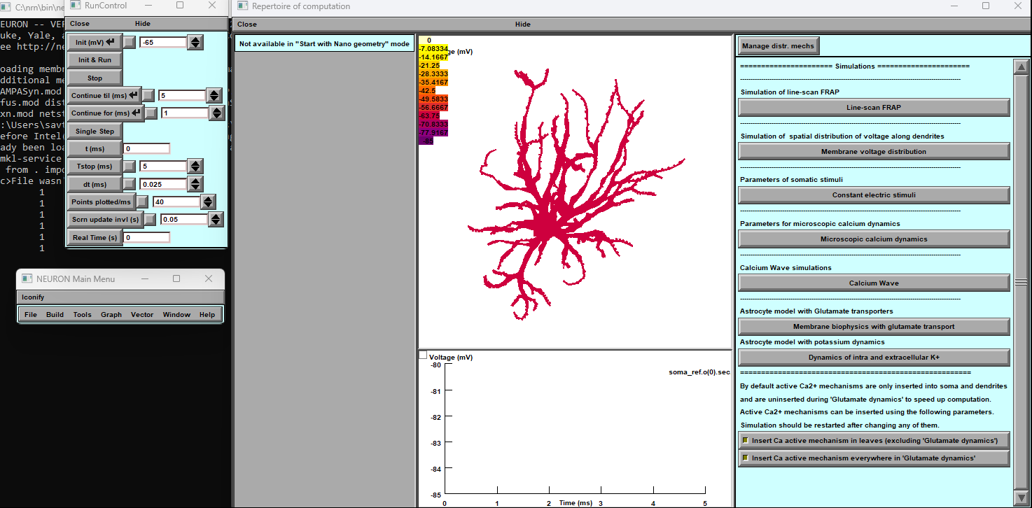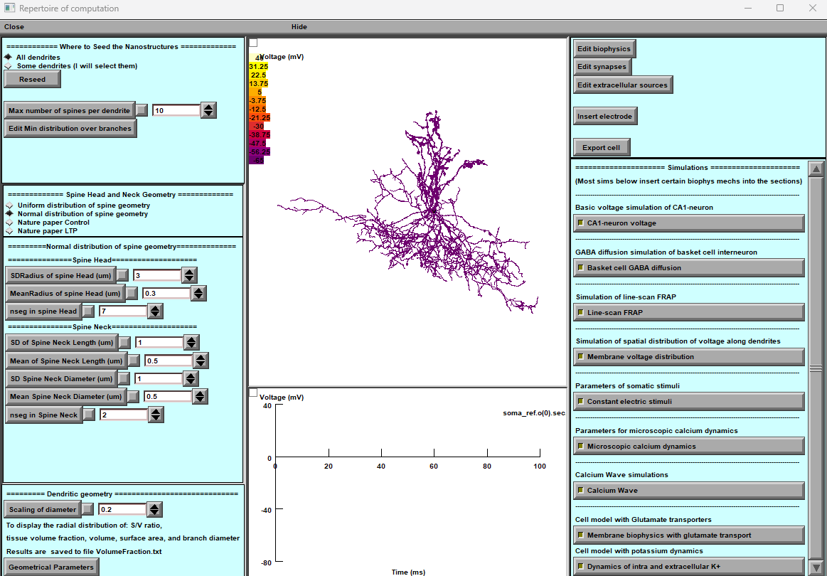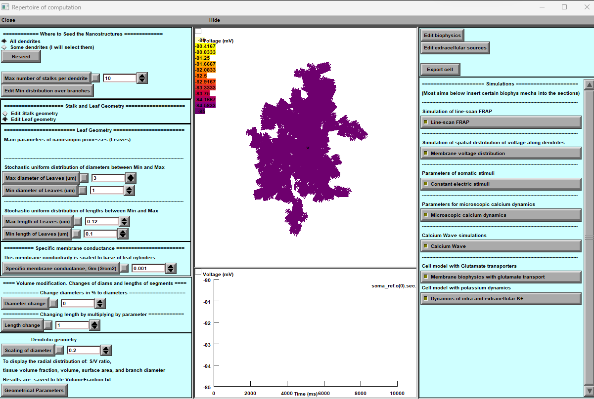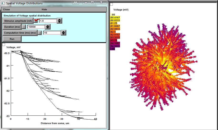 In the main control panel, pressing 'Compute the spatial voltage distribution' opens window panels which report membrane voltage across selected cell processes upon a step current injection at the soma (a common electrophysiological test scenario). The default resting potential is -85 mV.