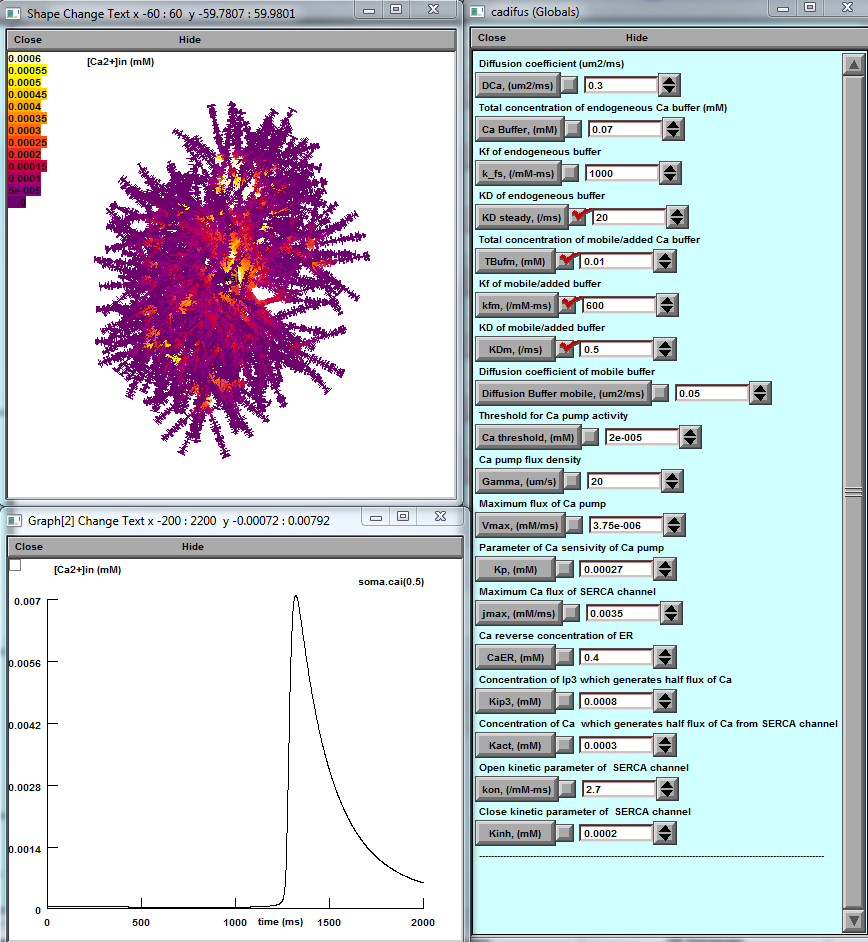 The current BrainCell version enables simulation of the two following scenarios: (i) macroscopic Ca2+ dynamics over the entire cell morphology and (ii) oscillatory, single-channel type Ca2+ entry dynamics on the nanoscopic or microscopic scale within one or two selected processes.