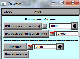 'IP3 increase onset (ms)', sets the onset of a step increase in the IP3 concentration; 'IP3 peak concentration (mM)', sets amplitude (0.005 mM shown).