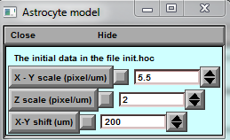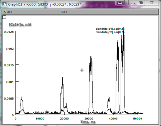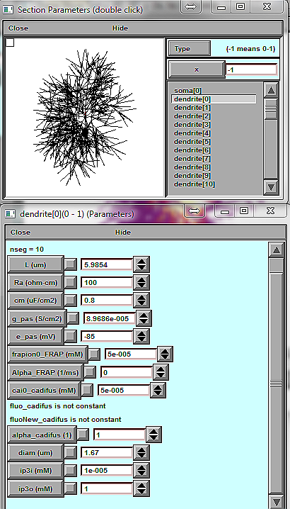 A new simulation run can start once the current run has ended. 'Graph' panel (Fig. 26b, bottom) provides [Ca2+] time course in the soma. The current BrainCell version deals with IP3 rises at the soma but it can be adapted to 'release' IP3 locally at any place in the astrocyte.