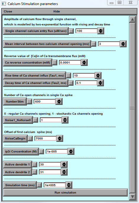 Utilizing this panel, users can tailor the simulation parameters to better comprehend and simulate the nuanced dynamics of calcium entry at a microscopic level.