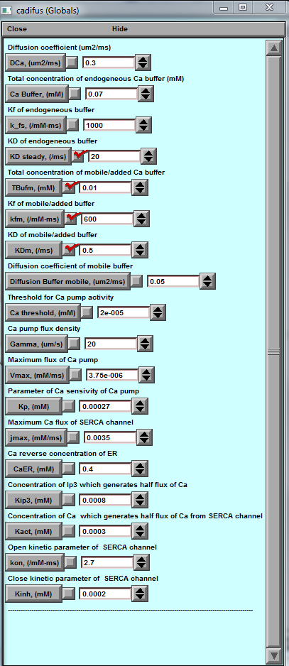 Two types of buffers are used, mobile "bufm" and endogenous "bufs" with corresponding kinetic constants kf and KD