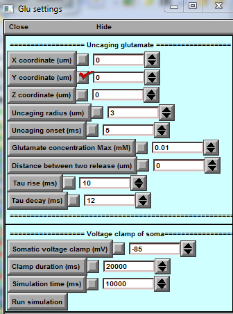 'Glutamate concentration Max (mM)' sets the maximum glutamate concentration during uncaging. 'Rise' and 'Decay tau (ms)' set the dynamics of glutamate uncaging.