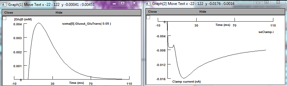 'Uncaging glutamate' panel (Fig. 28a, top) provides self-explanatory parameter settings for volume-limited glutamate application (uncaging) within a round area of the cell. The glutamate transporter kinetics (Bergels and Jahr, 1997 Neuron 19: 1297-1308) includes six independent states (Ci, where i =1,…,6). The detailed description can be found the GluTrans.mod file. The basic relationships are