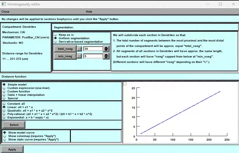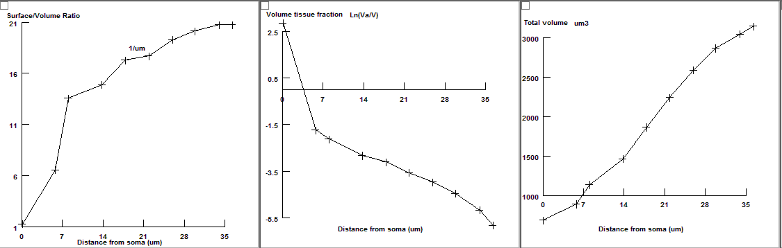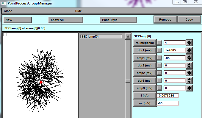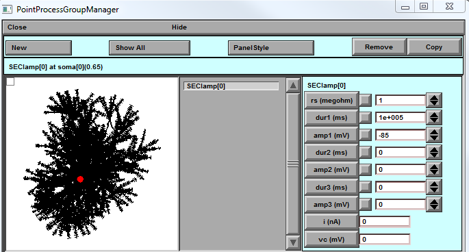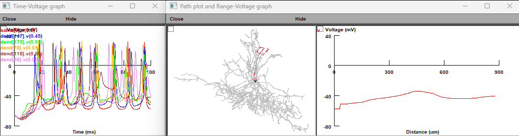 Figure 25. Window panel to monitor membrane space voltage distribution. A, Settings panel with space profile of voltage after inserting 1.5 nA into the soma. b, Dynamic voltage landscape mapped on the cell morphology. c, The corresponding voltage profile plot along individual processes ('dendrites' in NEURON).