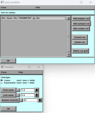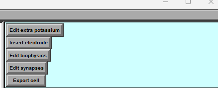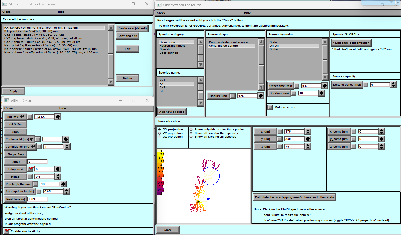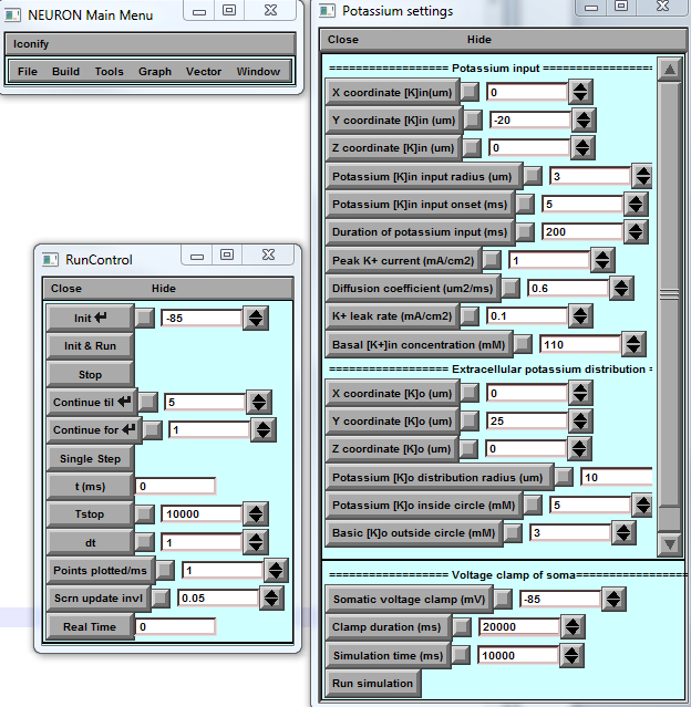 A standard NEURON panel (Fig. 29a) is to control simulation and visualise the outcome. The 'Potassium settings' panel (Fig. 29b) provides self-explanatory parameter settings for volume-limited potassium application (local current) within a round area of the cell. Here, [K+] dynamics are computed in somatic voltage clamp configuration: the clamp parameters are indicated on the panel 'Somatic voltage clamp' (Fig. 29a, bottom) including electrode resistance, clamp voltage and duration
