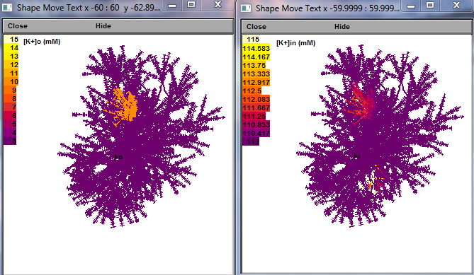 Figure 30. Window panels displaying simulated dynamics of intracellular [K+]in and extracellular [K+]o steady-state distribution mapped onto cell morphology (a) and (b), and [K+]in time course (c) at a selected branch (dendrite), in response to volume-limited injection of potassium current (as in Fig. 29).
