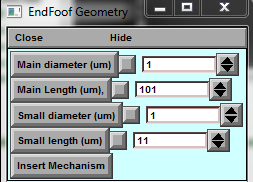 Figure 29. Window panels to control and monitor intracellular K+ dynamics and extracellular K+steady-state distribution. a, Parameter settings for monitoring [K+]in and [K+]o landscape mapped onto cell morphology. b, Parameter settings pertinent to volume-limited [K+]in entry and [K+]o distribution. c, Shape visualisation with voltage-clamp positioning. d, Somatic voltage clamp applied (bottom), for the sake of simplicity.