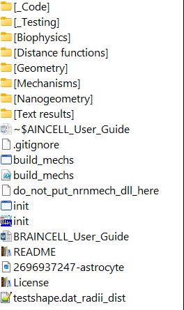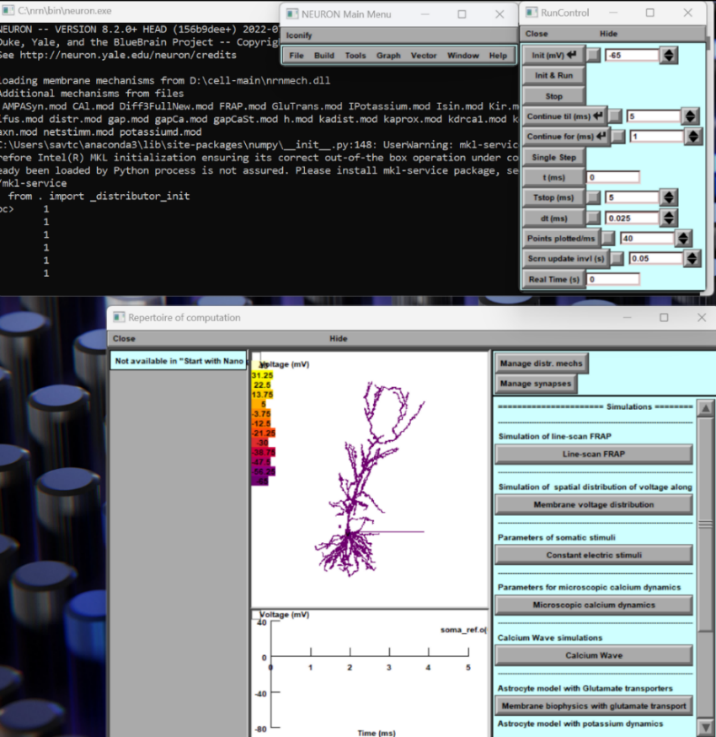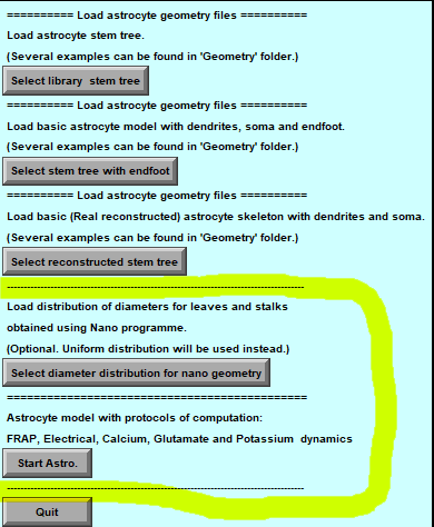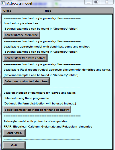 This part of BrainCell deals with simulations of membrane mechanisms (passive electrical properties, voltage-dependent channels, ion exchange, receptor current, etc.) and intracellular processes (Ca2+ entry, buffering, diffusion, and removal mechanisms) acting in morphologically realistic astrocytes. Most of the programming routines involved are an inherent part of the NEURON environment, with the full guidance available in the NEURON documentation