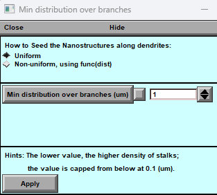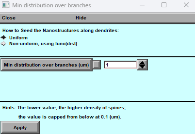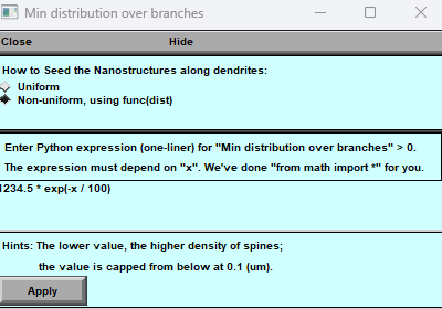 Neuronal plasma membranes are enriched in high-affinity glutamate transporters which generate rapid inward current upon glutamate binding. In BrainCell main panel, pressing 'Glutamate transporters' key opens the menu (Fig. 28), which enables simulations of the dynamic membrane voltage landscape mapped onto cell morphology, in response to volume-limited application ('uncaging') of glutamate at a selected area of the cell.