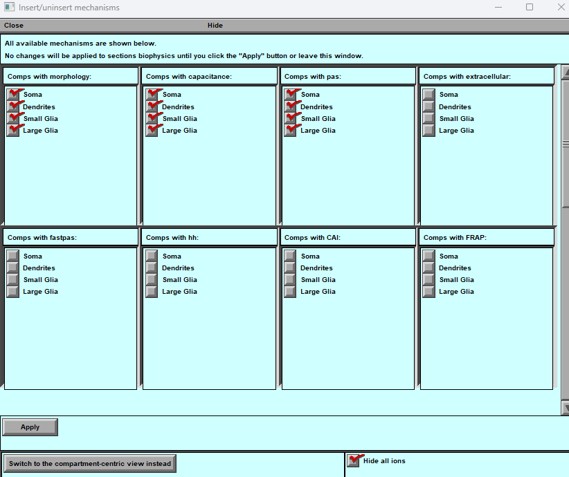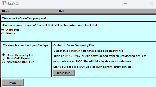 - In the BRAINCELL window, you can select either "Astrocyte" or "Neuron" per your requirements.