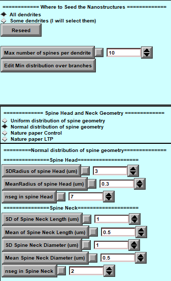Figure 27. Window panels to control and monitor microscopic [Ca2+] dynamics. a, Parameter settings for single-channel Ca2+ dynamics ('sparks' and 'puffs') in two selected 'active' branches (bottom: 'dendrite' numbers 30 and 31 are shown, in NEURON nomenclature). b, Visualisation of internal [Ca2+] dynamics mapped on cell morphology (top), and [Ca2+ ] time course in two selected dendrites (bottom; dendrites d1 and d2 are shown); yellow circle depicts the area of interest ('dendrites' 30 and 31). c, Parameter setting panel for Ca2+ reaction-diffusion processes (as in Fig. 26c).