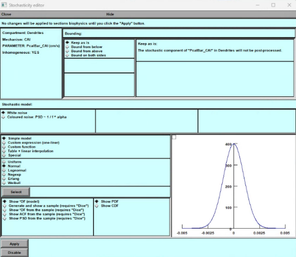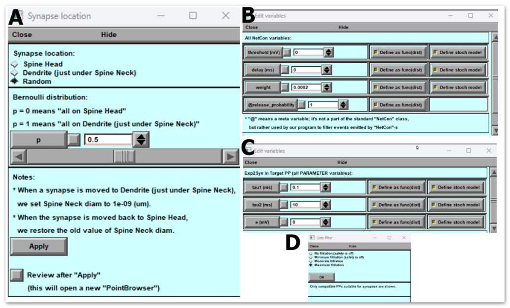 The 'Calcium Stimulation Parameters' panel, depicted in Figure 27a, facilitates the adjustment of critical parameters governing microscopic Ca2+ entry kinetics. This entry process is hypothesized to comprise a sequence of stochastic Ca2+ channel openings encompassing higher-frequency bursts. Notably, many of these parameters still need to be discovered, emphasizing the need for ongoing investigative exploration and research.