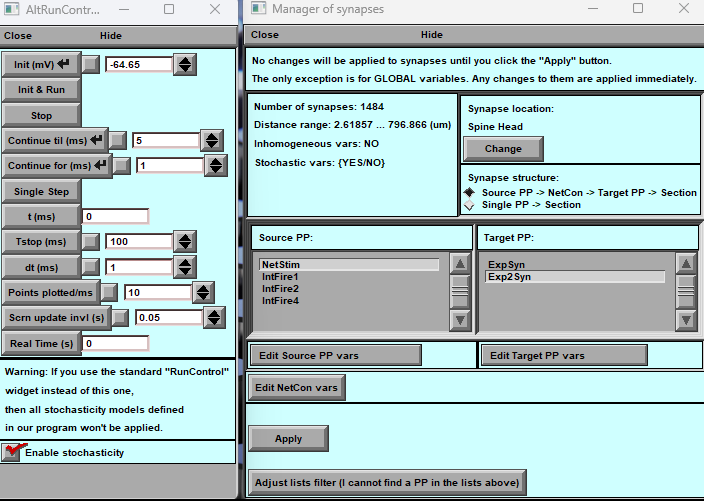 In addition to the NEURON-default IP3-dependent Ca2+ mechanism, one can use two alternatives developed earlier specifically for astroglia: one incorporating glutamate-dependence of IP3 concentration (De Pitta et al, 2009, J Biol Phys 35:383-411), and one involving a specific IP3-receptor dynamics (Fink et al, 2000, Biophys J 79:163-83). To use the De Pitta mechanism, (i) set IP3 concentration to zero (Fig. 23a panel), and (ii) invoke cadifus mechanism in the standard 'MechType' NEURON menu: glutamate concentration set by the 'ModelStim_cadifus' button.