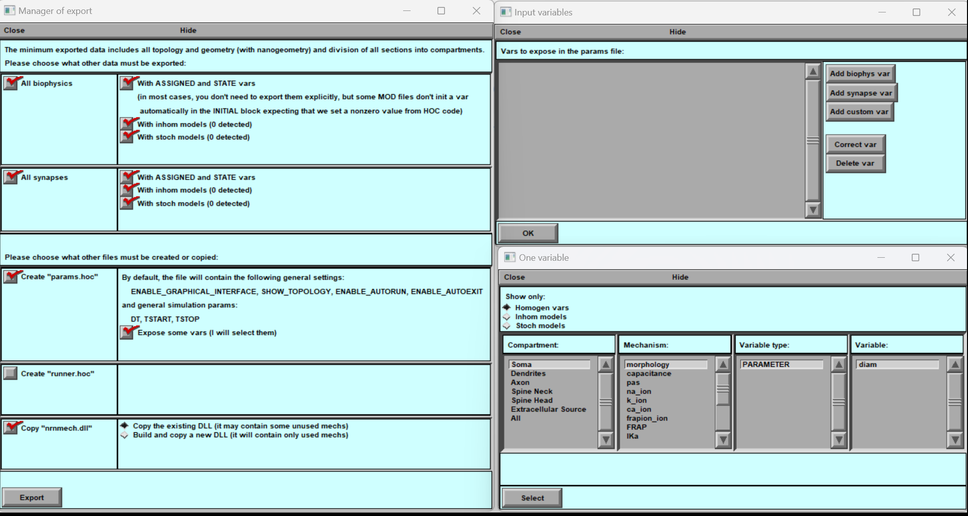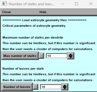 BrainCell provides simulation and analyses of the intracellular Ca2+ dynamics - including entry, buffering, diffusion, regenerative waves, and removal - across the entire astrocyte morphology. This type of simulation may require significant computational resources. Shorter-duration (1-1000 ms) trials could be feasible on the Host computer alone. Simulating more extended events over large cell areas will probably require a dedicated Worker computer/cluster. This computation can be done after the export cell with critical parameters.