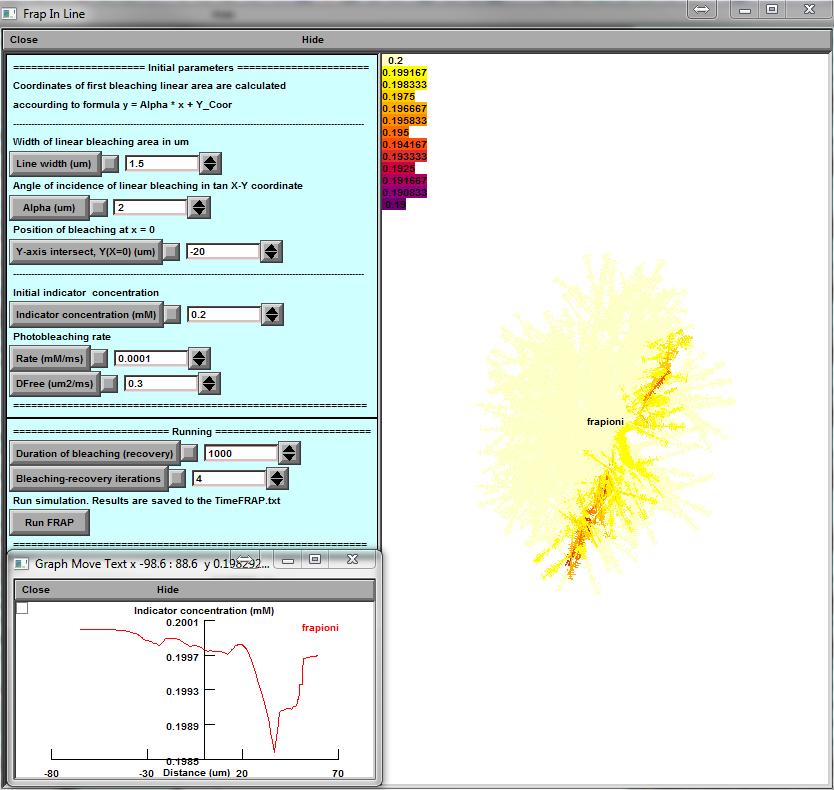 Figure 24. Window panels to control and monitor simulated linescan FRAP. A, Parameter settings panel. B, Concentration dynamics of non-bleached molecules, colour-coded and mapped on cell morphology. C, Concentration space profile sample.